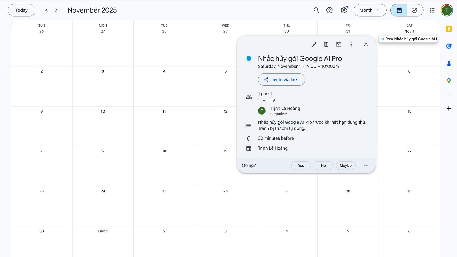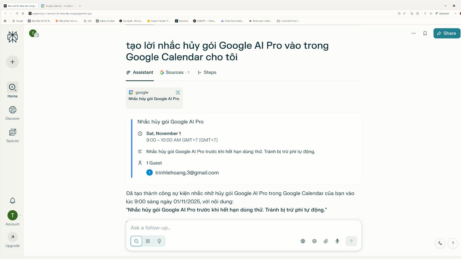 Nếu trong email có thông tin về gói Google AI Pro sẽ tự động gia hạn, để tránh quên ngày hủy gói thì mình có thể yêu cầu Comet: “Tạo lời nhắc hủy gói Google AI Pro vào trong Google Calendar cho tôi.” Comet sẽ tự động tạo một sự kiện trên ứng dụng Google Lịch để nhắc nhở mình.