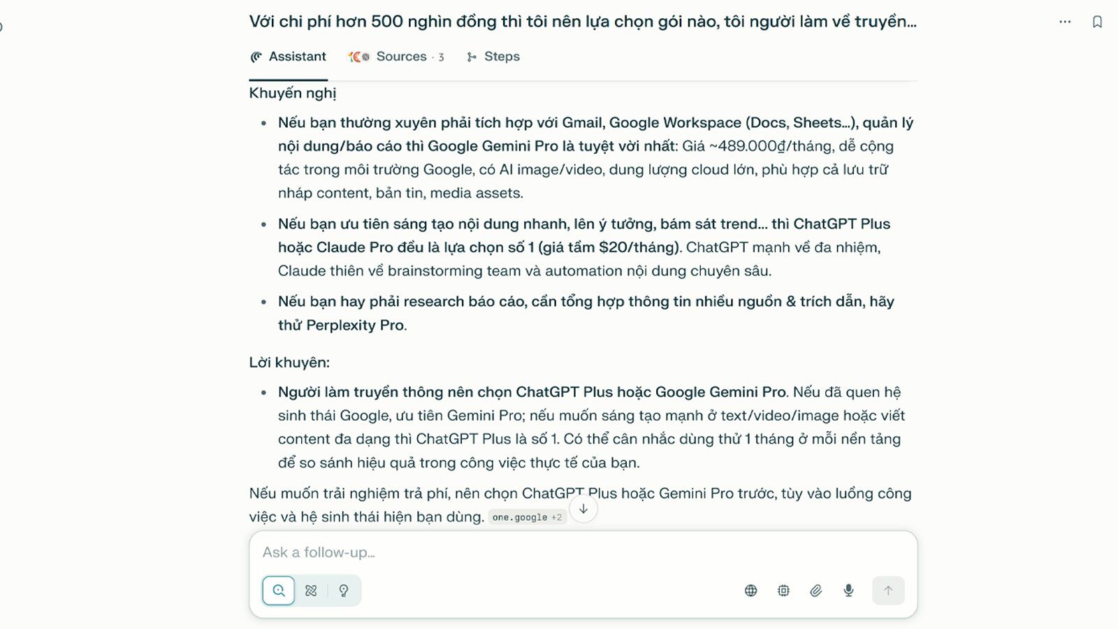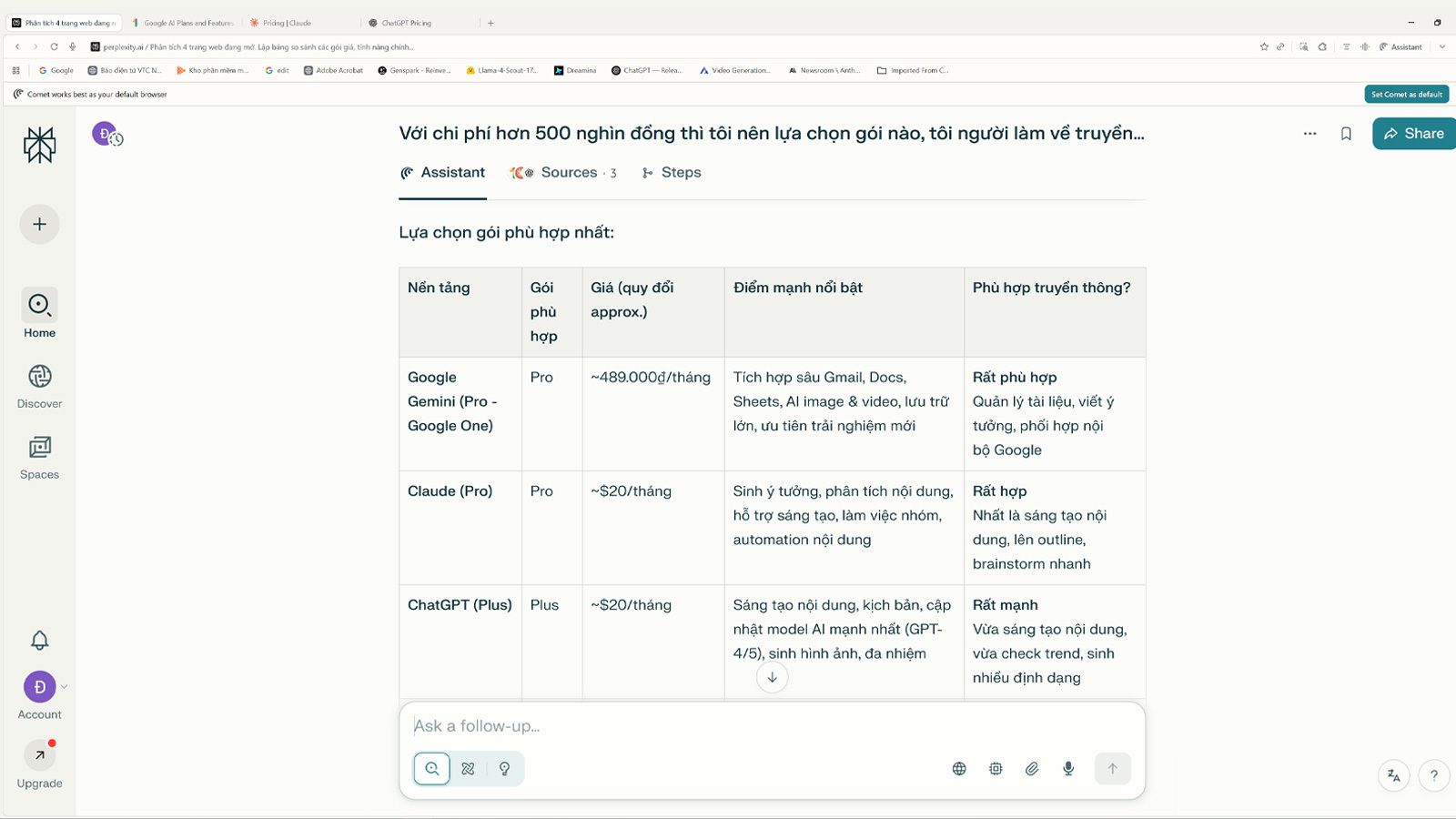Mình có thể hỏi tiếp: “Với chi phí hơn 500 nghìn đồng, người làm truyền thông nên lựa chọn gói nào?” và Comet sẽ tiếp tục phân tích để đưa ra gợi ý phù hợp. Nếu không có tính năng này, quy trình thông thường của mình sẽ mất thời gian hơn: phải tự chuyển đổi qua lại giữa các tab, tìm, sao chép thông tin, sau đó mở một ứng dụng khác như Excel hoặc Google Sheets để tự tạo bảng so sánh. Tính năng này đã tự động hóa hoàn toàn các bước tốn thời gian đó, giúp mình tập trung vào việc phân tích thay vì phải đi thu thập dữ liệu.