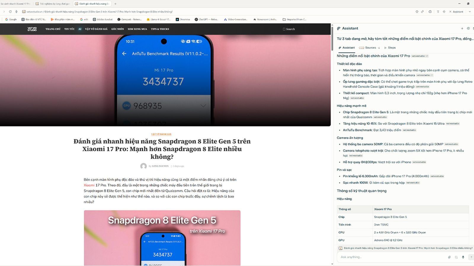 Với một ví dụ khác, khi mình mở 3 bài viết về chủ đề “Xiaomi 17 Pro”, mình chỉ cần bật tính năng Assistant ở góc phải trình duyệt và yêu cầu: “Từ 3 tab đang mở, hãy tóm tắt những điểm nổi bật chính của Xiaomi 17 Pro, đồng thời liệt kê các thông số quan trọng.” Tính năng Assistant của Comet sẽ đọc và tổng hợp thông tin thành một bản tóm tắt có cấu trúc, bao gồm các điểm nổi bật và bảng thông số đúng như yêu cầu, giúp mình nắm bắt nội dung nhanh chóng.