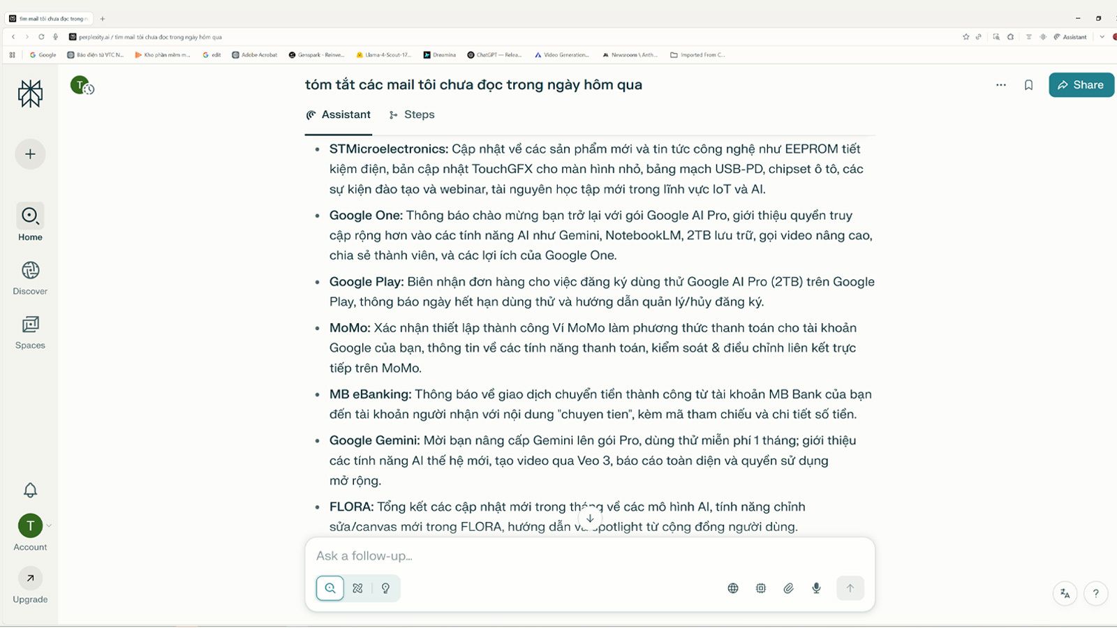 Khả năng tích hợp sâu với Gmail và Google Calendar giúp Comet trở thành một công cụ quản lý công việc và lịch trình rất hiệu quả, đặc biệt hữu ích với người làm văn phòng. Khi có nhiều email chưa đọc, mình có thể yêu cầu: “Tóm tắt các email tôi chưa đọc trong ngày hôm qua.” Comet sẽ tổng hợp và tóm tắt những email đó, giúp mình nắm bắt thông tin nhanh chóng mà không cần phải đọc chi tiết từng mail.