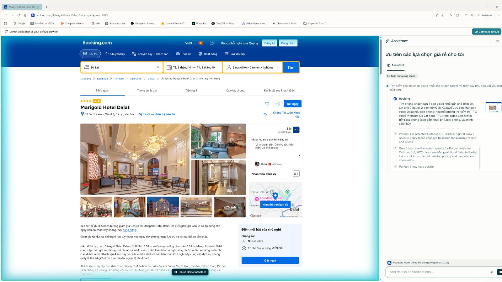 Sau đó mình có thể yêu cầu Comet đặt phòng luôn hộ mình bằng câu lệnh: “Bạn hãy đặt khách sạn và vé máy bay luôn hộ tôi, trước khi chốt nhớ hỏi tôi 1 lần nữa, ưu tiên các lựa chọn giá rẻ cho tôi” Comet sẽ tự động điều hướng và điền các thông tin cần thiết vào trực tiếp trong trang web đặt phòng và trang đặt vé máy bay, điều mình cần là cung cấp thêm thông tin cá nhân như tên tuổi và số điện thoại vì Comet sẽ không thể tự biết được.