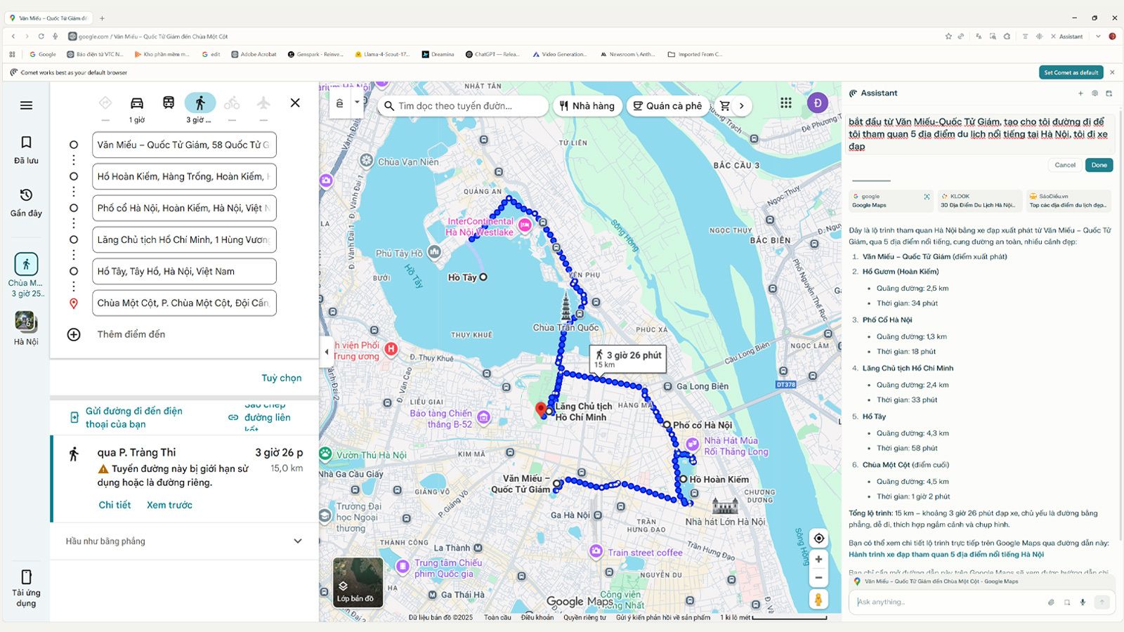 Với một ví dụ khác, trong giao diện web của Google Maps, mình có thể bật Assistant và dùng lệnh: “Bắt đầu từ Văn Miếu-Quốc Tử Giám, tạo cho tôi đường đi để tham quan 5 địa điểm du lịch nổi tiếng tại Hà Nội bằng xe đạp.” Tính năng Assistant của Comet sẽ tìm kiếm các địa điểm phù hợp phù hợp với tiêu chí và tạo một lộ trình chi tiết trên Google Maps.